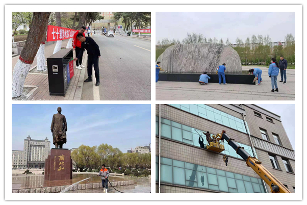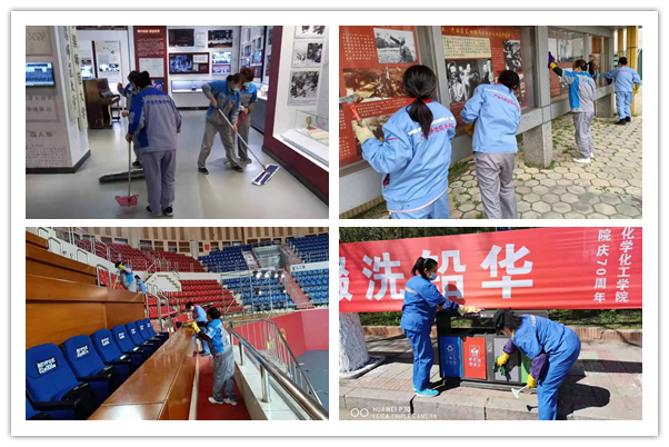 为了以更加整洁美丽、和谐温馨的校园环境迎接校友和嘉宾,产业处多措并举,全力做好保洁工作。保洁服务中心全面加强校园卫生保洁力度,统一布置,量化工作任务,落实工作责任。所有员工加班加点提前对楼宇外墙、卫生洁具、墙砖地砖、玻璃幕墙、教室操场等设备设施进行全面清洗和消杀工作,以保证公共安全和整体美观;对学校路面、垃圾箱及白色垃圾开展“地毯式”清理,让学校内的雕塑和景观石“洗新革面”,使校园的美化效果得到提升,营造了浓厚的校庆氛围。同时积极做好校史馆、文博馆、体育馆、科学会堂、图书馆等各类校庆活动场所的卫生保洁工作。