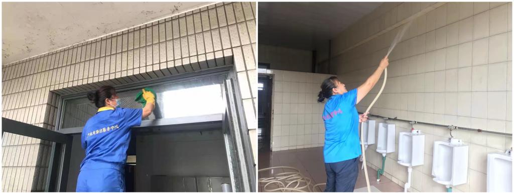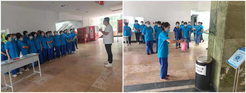 本次演练主要分为以下七个部分,一是进入学校时进行测温、扫健康码、检查口罩佩戴情况并进行登记;二是到达工作楼宇后更换工作服,戴好口罩和防护手套后打开公共区域的窗户进行通风;三是保洁员到洗手间按照1:40的比例来稀释84消毒液,进行全方位的消毒喷洒,对楼内废弃口罩收集箱要多次消毒。对收集箱内的废弃口罩袋封闭好,单独存放送到指定地点;四是消毒后进行日常工作打扫卫生,将本岗位收集的垃圾倒入垃圾袋后再进行消杀处理后密封垃圾袋,严禁垃圾泄漏或暴露于空气中;五是将密封好的垃圾袋拿到楼下垃圾指定存放地点;六是室外保洁人员对校园内分类垃圾箱内分类垃圾及时回收,运送到学校垃圾站进行分类处理,并对分类垃圾箱进行消杀灭菌。对校园内废弃口罩收集箱内口罩袋封闭好运送到指定地点。对废弃口罩垃圾箱进行消杀灭菌;七是垃圾清运员及时清运各个单位的垃圾袋到校垃圾转运站,装入市政垃圾车后离开学校。对垃圾站进行全方位消杀灭菌。