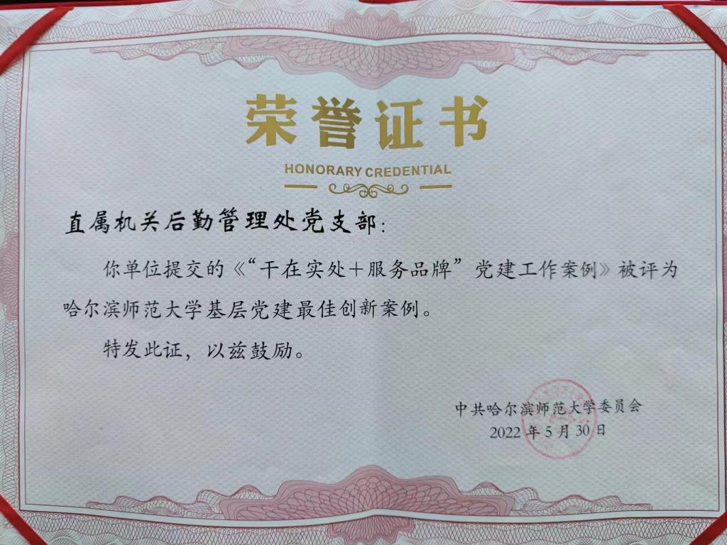 近日,在哈尔滨师范大学党委组织的党建案例评选工作中,直属机关后勤管理处党支部提交的《“干在实处+服务品牌”党建工作案例》获评哈尔滨师范大学基层党建最佳创新案例。