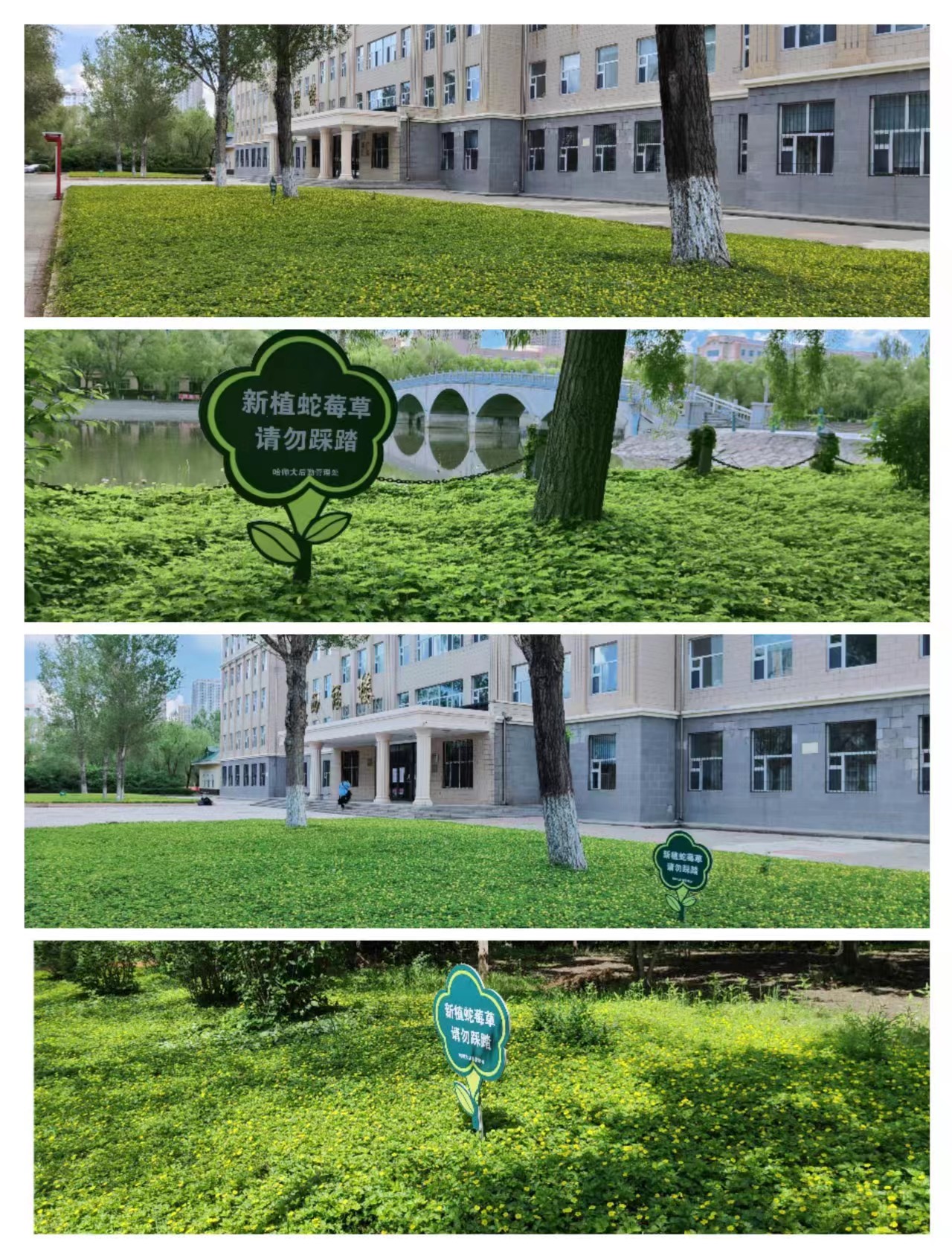 2020年7月,后勤管理处采购了50000株委陵菜带钵株苗,分别栽植在西语楼前、天鹅湖与梦溪湖边两侧、万卷亭西侧,总计2700㎡绿地内,这部分绿地委陵菜生长茂盛、已成如茵绿毯之势;2021年7月,后勤管理处又采购了20000株散根株苗,栽植在研究生学院楼东侧1600㎡三块绿地内。这些栽植的绿色生命,在支部党员和园林工人的精心呵护下,已经呈现出一派生机勃勃的别样景致。