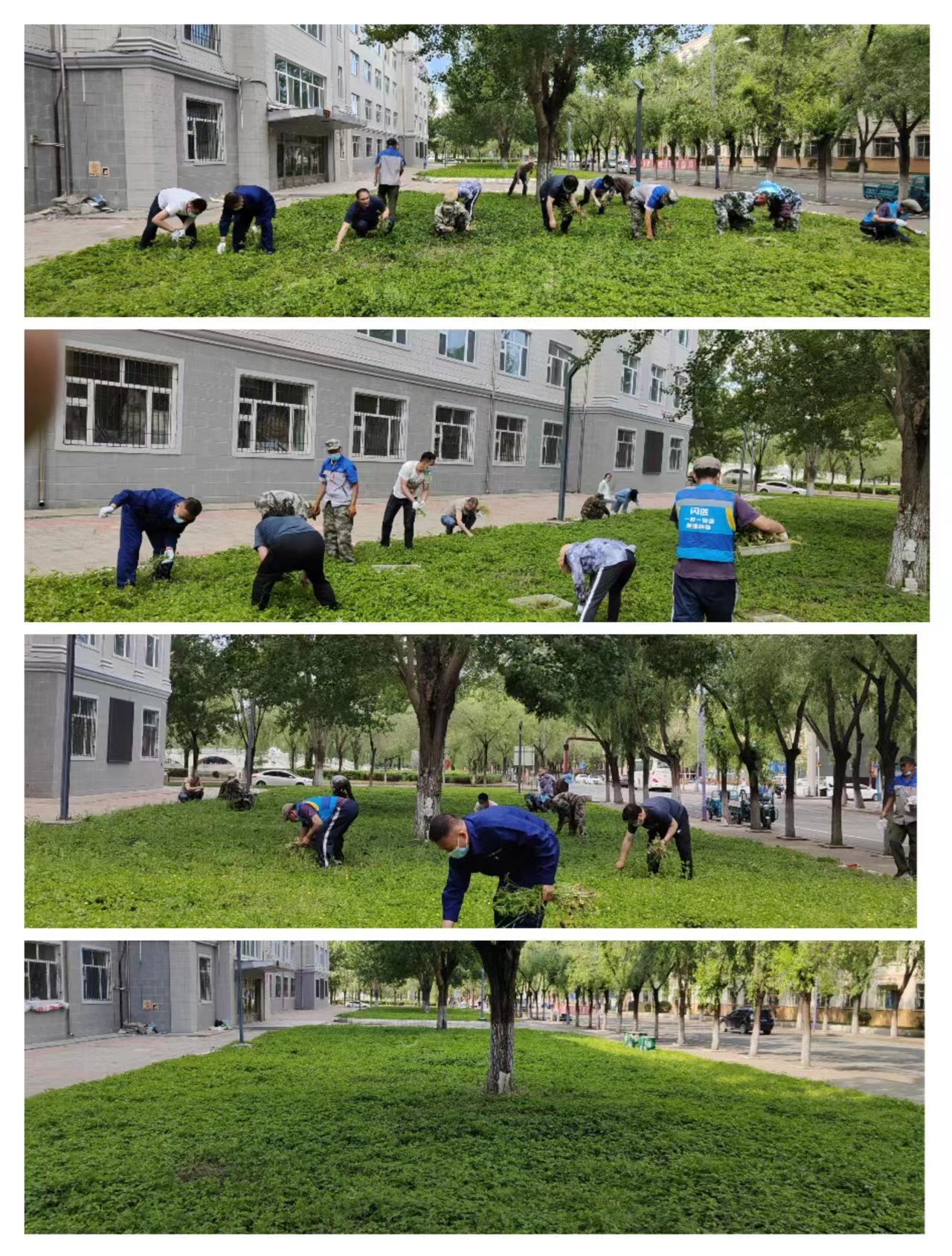 下午13时30分,支部部分党员同志身着便装,来到研究生学院楼东侧绿地内,与园林工人一起,对委陵菜(蛇莓草)彩化带内的杂草进行清理。党员同志们情绪高涨,一边拔草除杂,一边与工人师傅交流劳动体会,经过一个半小时的辛苦劳动,1600㎡绿地内的杂草被清理干净。看着经过双手劳动、付出辛勤汗水展示出的成果,体味着工人劳动辛苦的同时,大家收获着内心的充实与快乐。