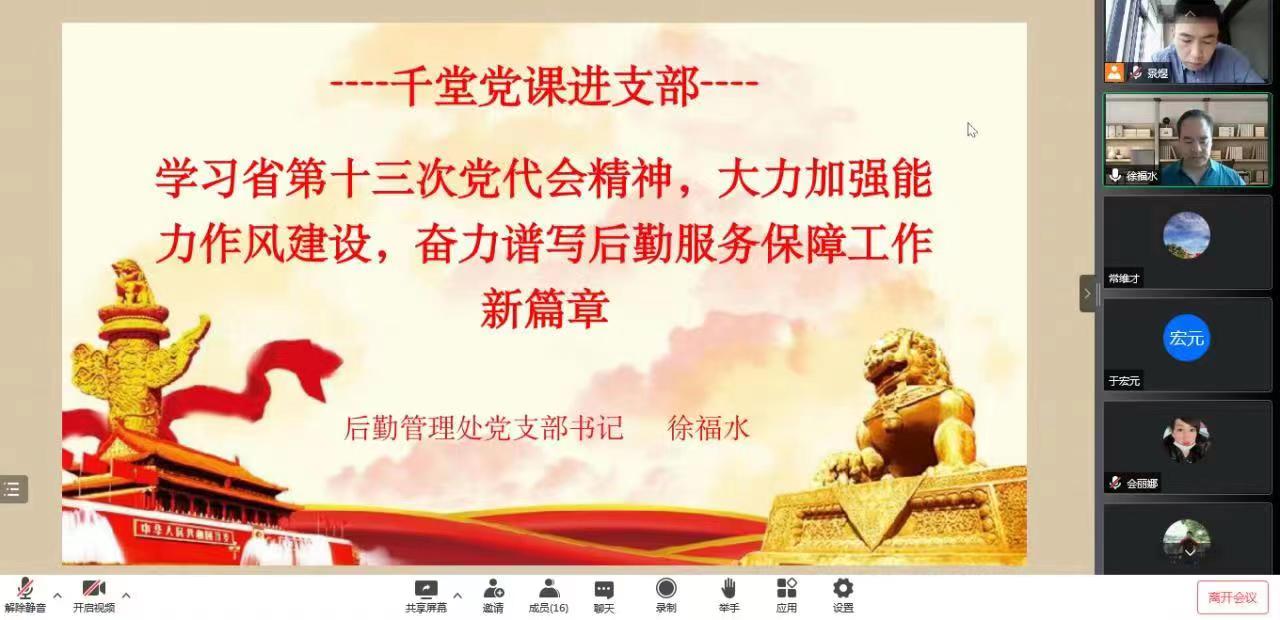 党支部书记徐福水以“学习宣传省第十三次党代会精神,大力加强能力作风建设,奋力谱写学校后勤服务保障工作新篇章”为题,围绕学习宣传贯彻大会精神,结合学校发展建设、能力作风建设以及部门中心工作,从“深入领会省第十三次党代会精神是指导未来五年全省工作的纲领性文件;深刻认识学校开展干部能力作风年活动的重大意义和目标任务;党员干部要在能力作风年活动中展现新担当新作为,奋力谱写工作新篇章”三个方面为全体党员讲授了专题党课。