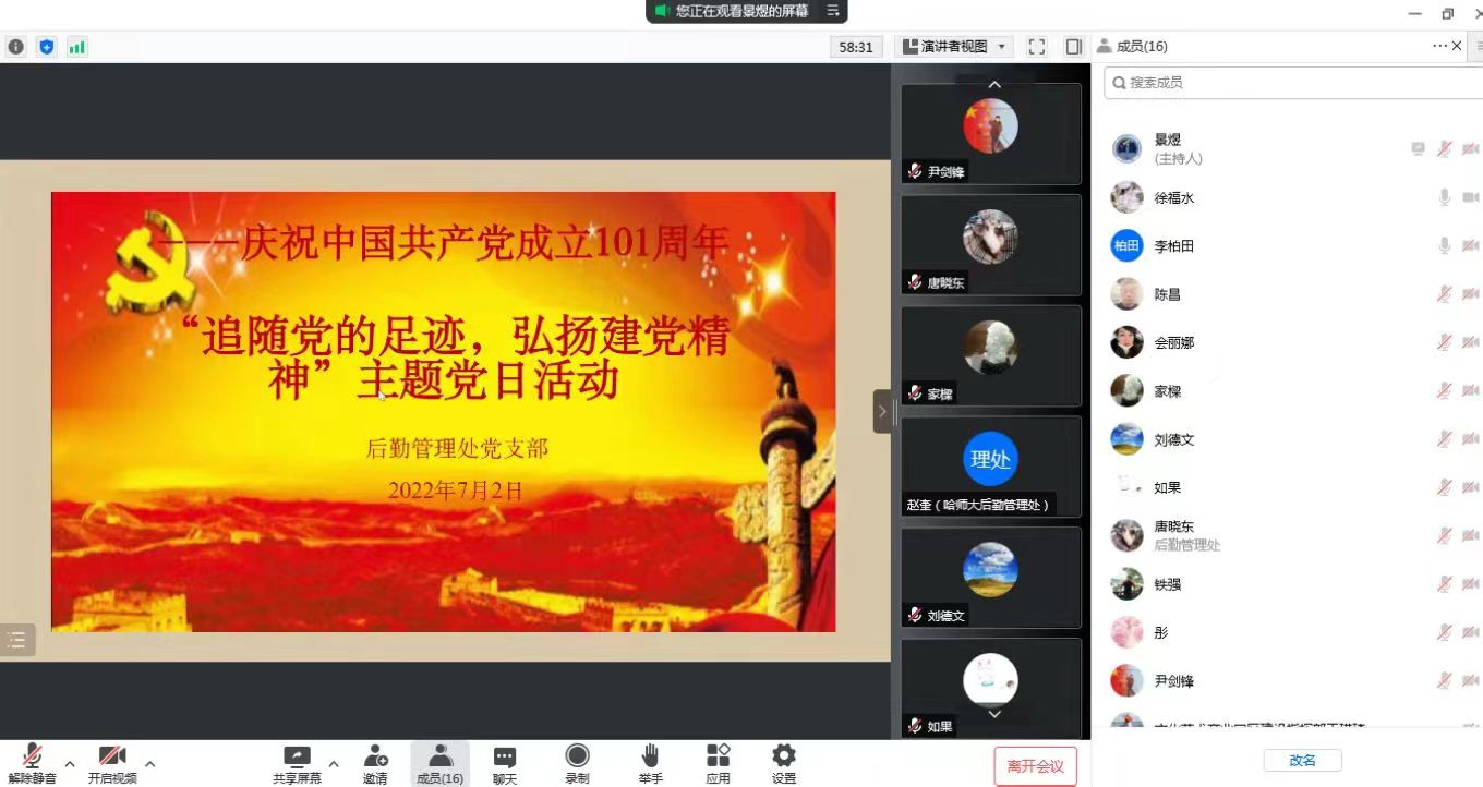 为庆祝中国共产党成立101周年,进一步激励全体党员干部不忘初心、牢记使命、干事创业、担当作为,按照直属机关党委关于“七一”期间开展“千堂党课进支部”系列主题党日活动的相关要求,7月2日上午9时,后勤管理处党支部以腾讯会议形式,组织开展了专题党课宣讲和“追随党的足迹、弘扬伟大建党精神”主题党日活动。学校党委常委、副校长尹剑锋以普通党员身份全程参加活动,活动由党支部宣传委员吕景煜主持。