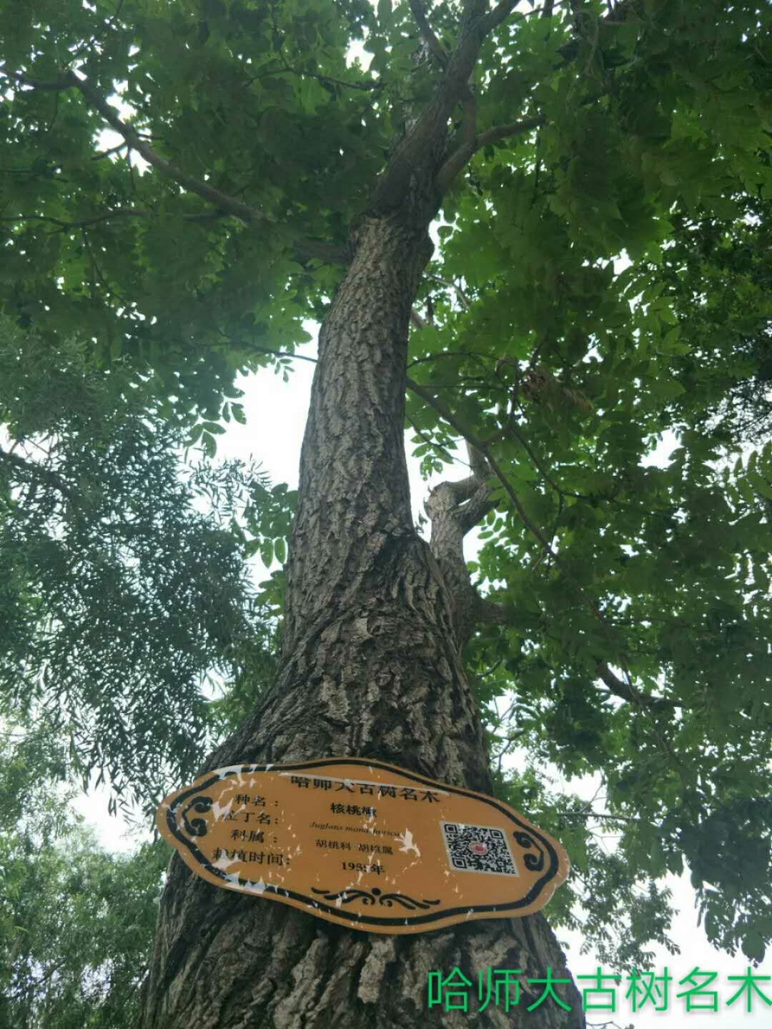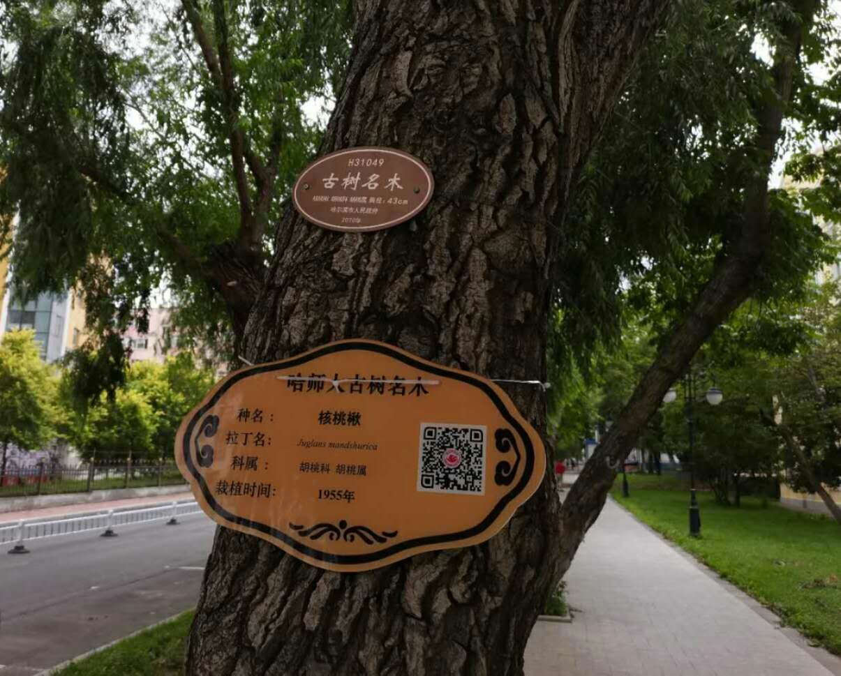 古树名木与学校同命运共成长,是校园环境文化特质和历史文化底蕴的见证。其认定工作是我校落实“五大发展”理念,尊重自然、顺应自然、保护自然的有力昭示,后勤管理处全程配合哈市园林管理部门实地调查,对树种、树龄估测、树木胸围、所处位置等进行了现场测量和古树编号确认,共认定古树名木25棵(G30718—G30724编号树木7棵;H31048—H31065编号树木18棵),其中核桃楸树7棵、黄檗树9棵、榆树9棵。后勤管理处对认定的古树名木制定了保护措施。设置了二维码标牌,组织专人对树木病虫害消杀、浇水、施肥、修枝和相关养护。古树名木的认定已经超越了单纯的绿化美化范畴,因为它是活的文物,是学校历史的见证。为广大学生践行“敦品励学,弘毅致远”校训,不忘“落其实者思其树,饮其流者怀其源”提供精神滋养。