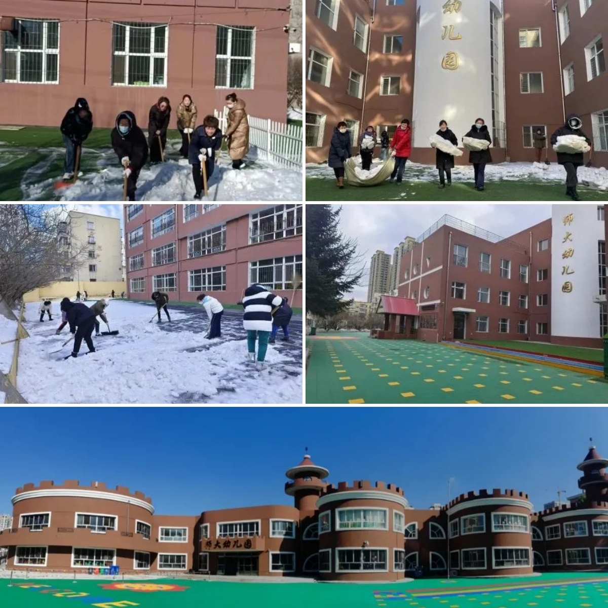 冬雪给美丽的幼儿园披上盛装,厚厚的白雪覆盖了学校各个角落,为了保障幼儿安全入园。各位园领导带领班级老师、后勤人员、门卫人员通力合作清除幼儿园积雪,不仅消除了幼儿园里因下雪造成的安全隐患,确保了园内主要道路、中心操场等处没有积雪结冰,更让幼儿园恢复了往日的亮丽多彩,保障了园内各项工作的正常开展。