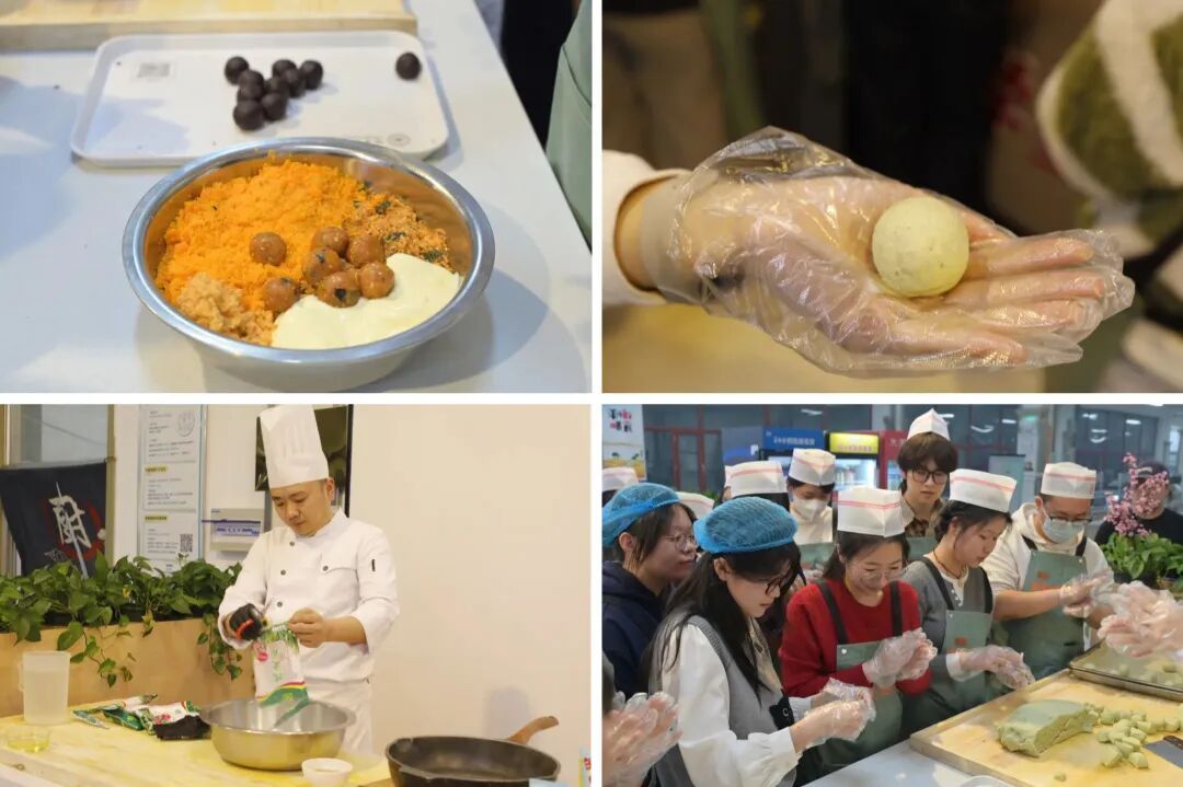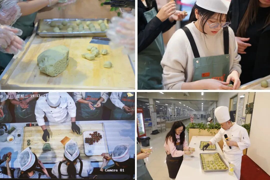 第二期“烹饪学堂”走进传统节令美食——清明青团。郭景瑞老师从唐代文人白居易笔下的“青团”讲起,带领同学们穿越千年,了解青团与寒食节、清明节的深厚渊源。从艾草挑选、糯米粉配比,到馅料的炒制,一一拆解,为学员们强调“色如碧玉、香糯不腻”的制作关键,让同学们在劳动中感受中华饮食文化的细腻与温度。