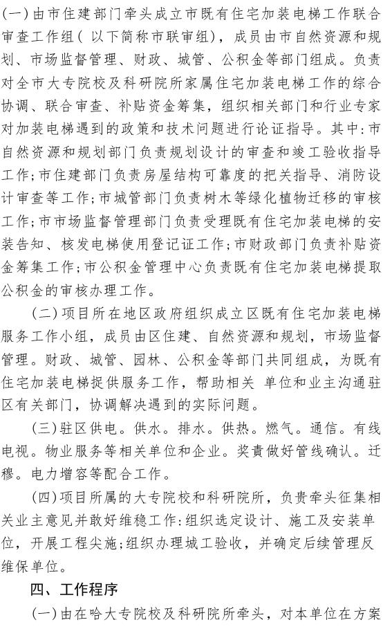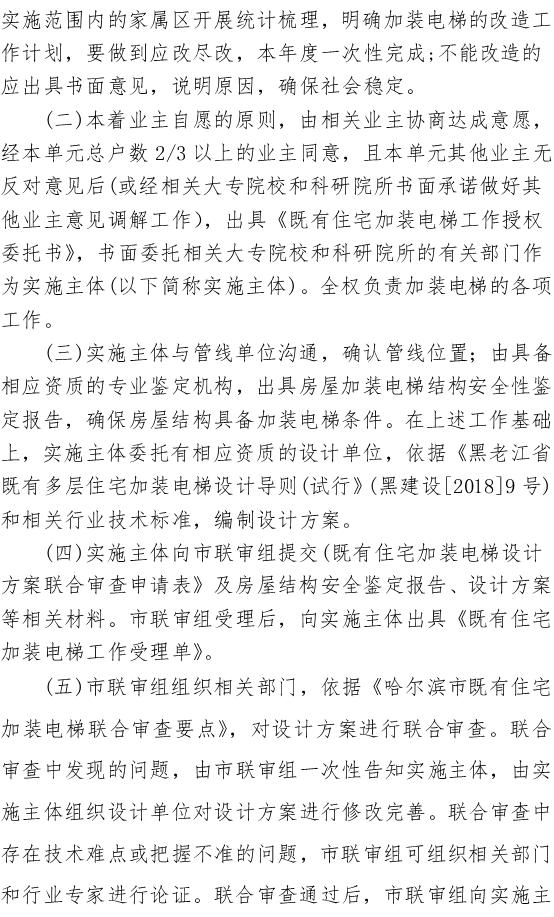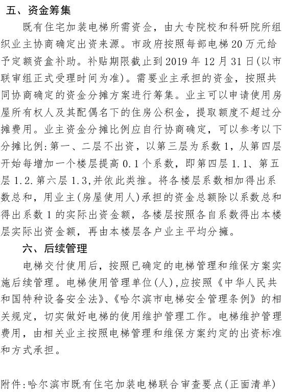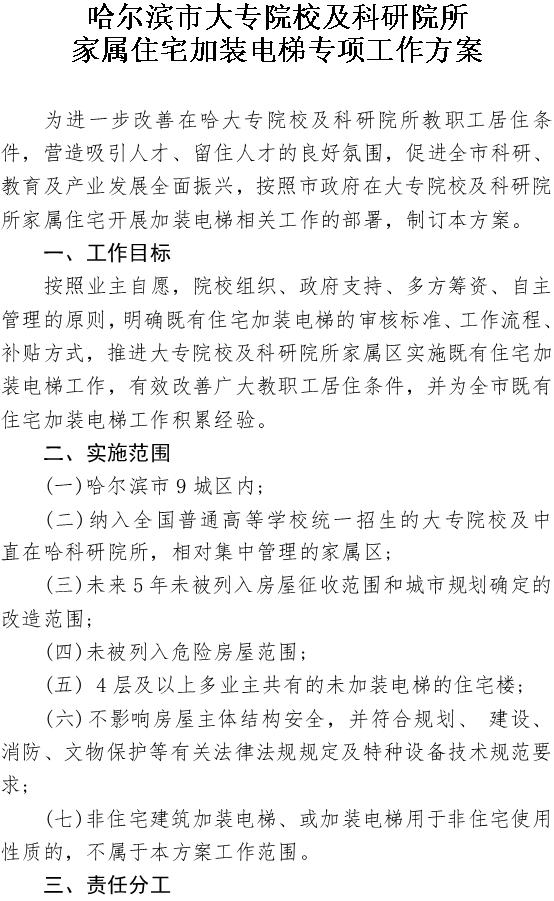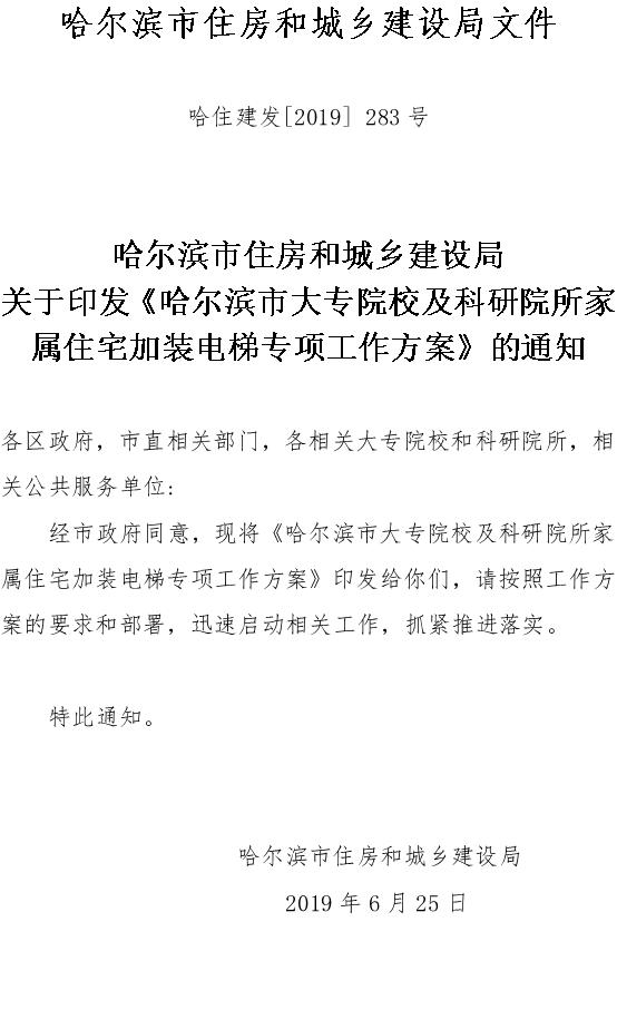 2019年6月25日,哈尔滨市住房和城乡建设局印发文件«哈尔滨市大专院校及科研院所家属住宅加装电梯专项工作方案»(哈住建发﹝2019﹞283号),推进在哈大专院校及科研院所既有住宅加装电梯工作。《方案》中明确,市政府按照每部电梯20万元给予定额资金补助,缺口资金由业主承担。由业主承担的资金,按照共同协商确定的资金分摊方案进行筹集,业主资金分摊比例应自行协商确定。具体内容请阅读«哈尔滨市大专院校及科研院所家属住宅加装电梯专项工作方案»(附件1)。