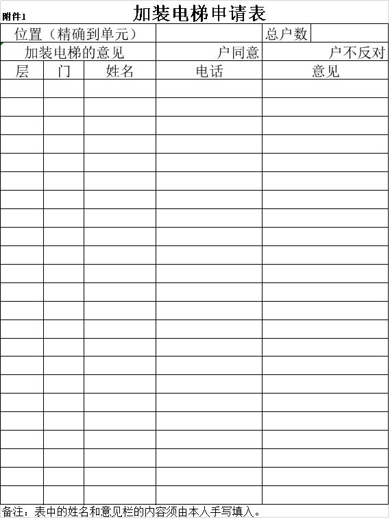 为更好推进此项工作,现就我校家属区加装电梯工作征求意见。请居民以单元为单位自行协商,如本单元总户数2/3以上的业主同意,且本单元其他业主无反对意见后,填写加装电梯申请表(附件2)。每个单元推荐1名代表持申请表,到物业进行报名登记,报名截止日期为2019年10月11日。未报名登记的单元视为无加装电梯意愿。学校根据报名情况,开展后续工作。